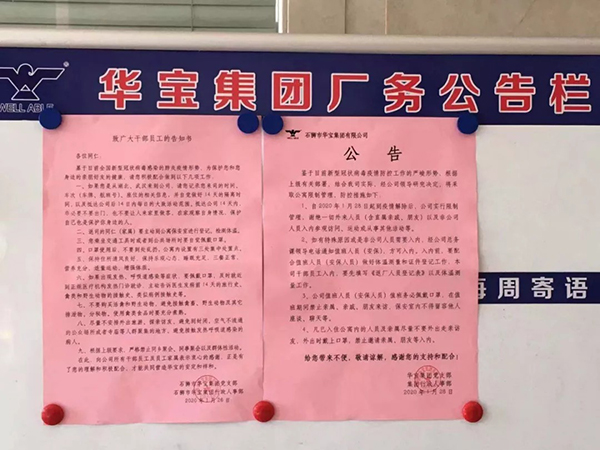 1.加強宣傳引導,凝聚抗“疫”思想意識 生命重于泰山,疫情就是命令,防控就是責任,宣傳就是力量。為了打好疫情攻堅戰(zhàn),華寶集團黨支部和企業(yè)管理人員凝聚了廣面宣傳的共識,充分利用了員工公告欄、車間廣播、橫幅、微信群、宣傳手冊等方式向在廠員工宣傳防疫知識,發(fā)動周邊群眾,全面參與防控.