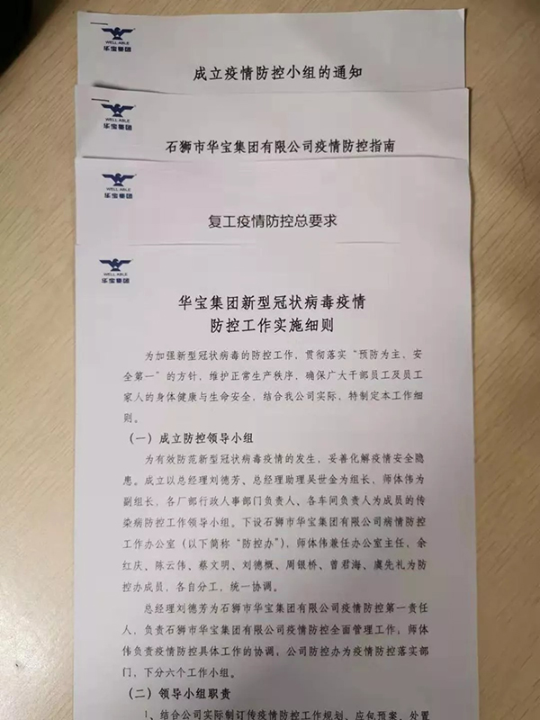 2.成立工作小組,強化抗“疫”責任落實 在華寶集團黨支部牽頭下,公司于元月28日成立了以集團總經(jīng)理為主的防控小組,多名黨員為組員,落實責任分工和防控責任。防控小組24小時待命指揮,保證公司生產(chǎn)有序,環(huán)境安全。