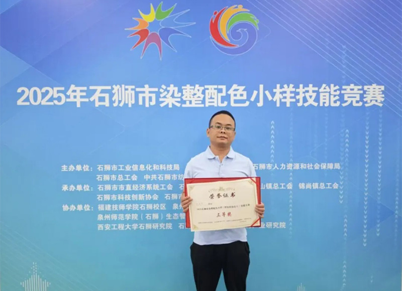 5月25日,2025年石獅市染整配色小樣(紡織染色工)技能競賽在福建技師學院寶蓋校區舉行。該競賽是石獅紡織服裝行業的常態賽事,也是2025年泉州市科技活動周暨石獅市科技、人才活動周和全國科技工作者日活動的系列活動之一,著重考驗參賽選手的配色及調色能力。 比賽項目分為A、B兩項,根據參賽者實際情況自由選擇A項或B項。其中,A項為長車軋染工藝及操作、B項為浸染工藝及操作。經過兩輪激烈角逐,最終我司員工邱尚東榮獲三等獎。