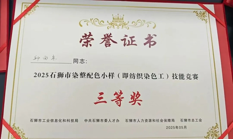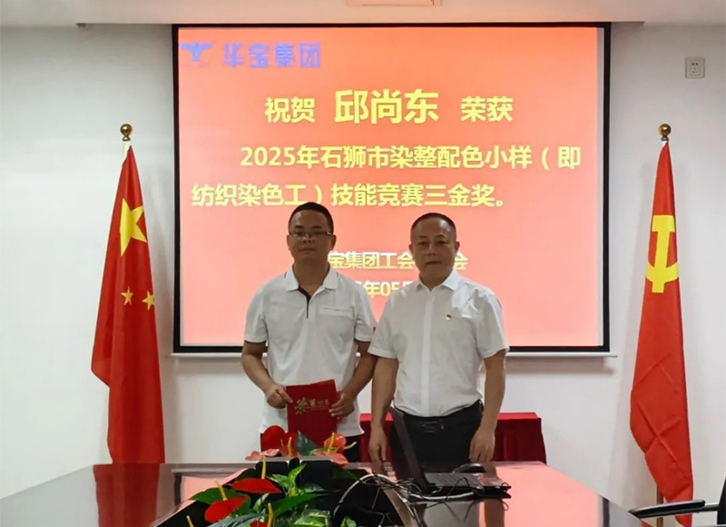 熱烈祝賀華寶集團旗下石獅市豪寶染織有限公司員工邱尚東獲得2025石獅市染整配色小樣(即紡織染色工)技能競賽三等獎。